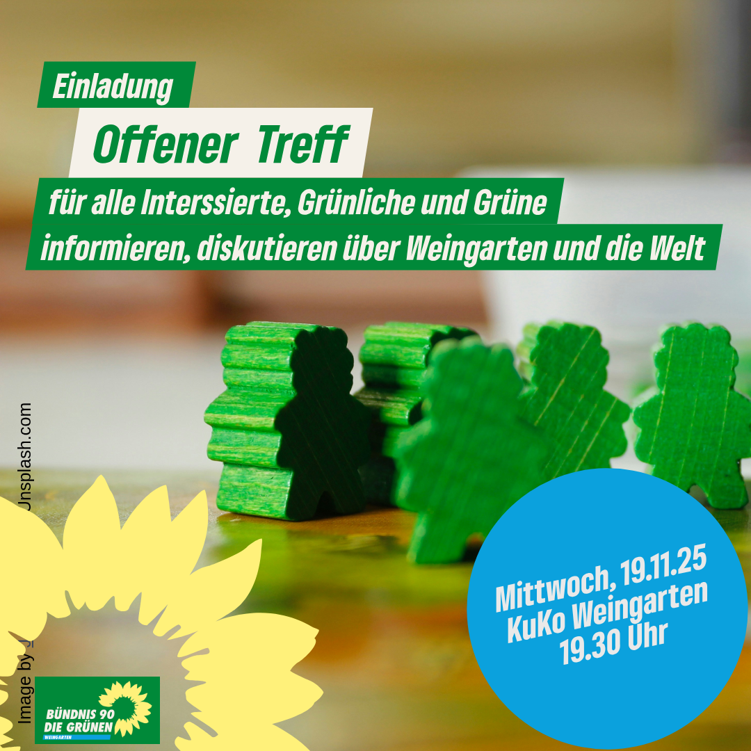 Lust auf gute Gespräche, neue Gesichter und spannende Themen rund um Politik? Dann schaut doch einfach vorbei bei unserem offenen Grünen-Treff! In lockerer Runde tauschen wir uns aus – über alles, was uns bewegt: Umwelt, Verkehr, Soziales oder einfach über das Leben. Mit dabei, grüne Gemeinderät*innen aus Weingarten, mit den neusten Gerüchten, härtesten Fakten und brutalsten Sparmaßnahmen und immer einem offenen Ohr für euer Anliegen. Wir freuen uns auf Euch! Ortsgruppe B’90/Die Grünen Weingarten